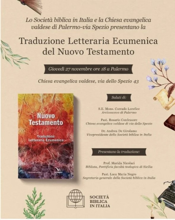 Una Bibbia cristiana ma non confessionale, nata dal lavoro congiunto di 18 diverse chiese e realizzata da un’équipe di 25 traduttori e revisori appartenenti alle principali confessioni cristiane italiane: è la Traduzione Letteraria Ecumenica (TLE) del Nuovo Testamento, una novità assoluta per il panorama biblico italiano, che unisce rigore scientifico, fedeltà ai testi originali e cura letteraria per offrire ai lettori una Parola condivisa, accessibile e di alta qualità.La nuova TLE sarà presentata a Palermo giovedì 27 novembre alle ore 18, presso la Chiesa evangelica valdese di via dello Spezio 43, nel corso di un incontro pubblico promosso dalla Società Biblica in Italia e dalla Chiesa evangelica valdese di Palermo–via dello Spezio.Porteranno i saluti S.E. Mons. Corrado Lorefice, arcivescovo di Palermo, il pastore Rosario Confessore della Chiesa valdese e il dott. Andrea De Girolamo, vicepresidente della Società Biblica in Italia. A illustrare il progetto e i criteri di traduzione saranno la prof.ssa Marida Nicolaci, biblista della Pontificia Facoltà Teologica di Sicilia, e il pastore Luca Maria Negro, segretario generale della Società Biblica in Italia.“La TLE è il frutto di un lungo cammino ecumenico che dimostra come la Parola possa unire invece di dividere – dichiara il pastore Luca Maria Negro –. È un testo fedele all’originale greco, curato nello stile e pensato per parlare al lettore contemporaneo, credente o non credente, in modo chiaro e autentico. Questa nuova traduzione non appartiene a una singola Chiesa, ma nasce dal confronto tra molte – aggiunge –. È un segno concreto di comunione e di collaborazione, un dono per la cultura e per la fede”.Realizzata sotto il coordinamento della Società Biblica in Italia (SBI), la TLE del Nuovo Testamento rappresenta la prima tappa di un percorso che punta alla futura traduzione ecumenica dell’Antico Testamento. L’opera è pubblicata insieme all’editrice Elledici, e con l’approvazione dell’Alleanza Biblica Universale, rete mondiale che riunisce oltre 200 società bibliche.“Siamo felici di portare a Palermo un progetto nato dal dialogo e dalla collaborazione tra chiese diverse – conclude il pastore Luca Maria Negro –. Palermo, città di incontro e accoglienza, è il contesto ideale per condividere un’opera che unisce competenze, sensibilità e tradizioni di fede differenti. La TLE ci ricorda che la Bibbia può essere, davvero, una casa comune per tutti”.L’appuntamento di giovedì 27 novembre offrirà alla comunità palermitana un’occasione per riscoprire la Bibbia come spazio condiviso di dialogo e di crescita comune, segno concreto di un ecumenismo che si fa vita e Parola.Fondata nel 1983, la Società Biblica in Italia è erede della Società Biblica Britannica e Forestiera (1804) e si impegna nella diffusione, traduzione e studio delle Scritture, promuovendo un approccio ecumenico e culturale che unisce il mondo della fede a quello della ricerca e della parola scritta.Traduzione Letteraria Ecumenica del Nuovo Testamento