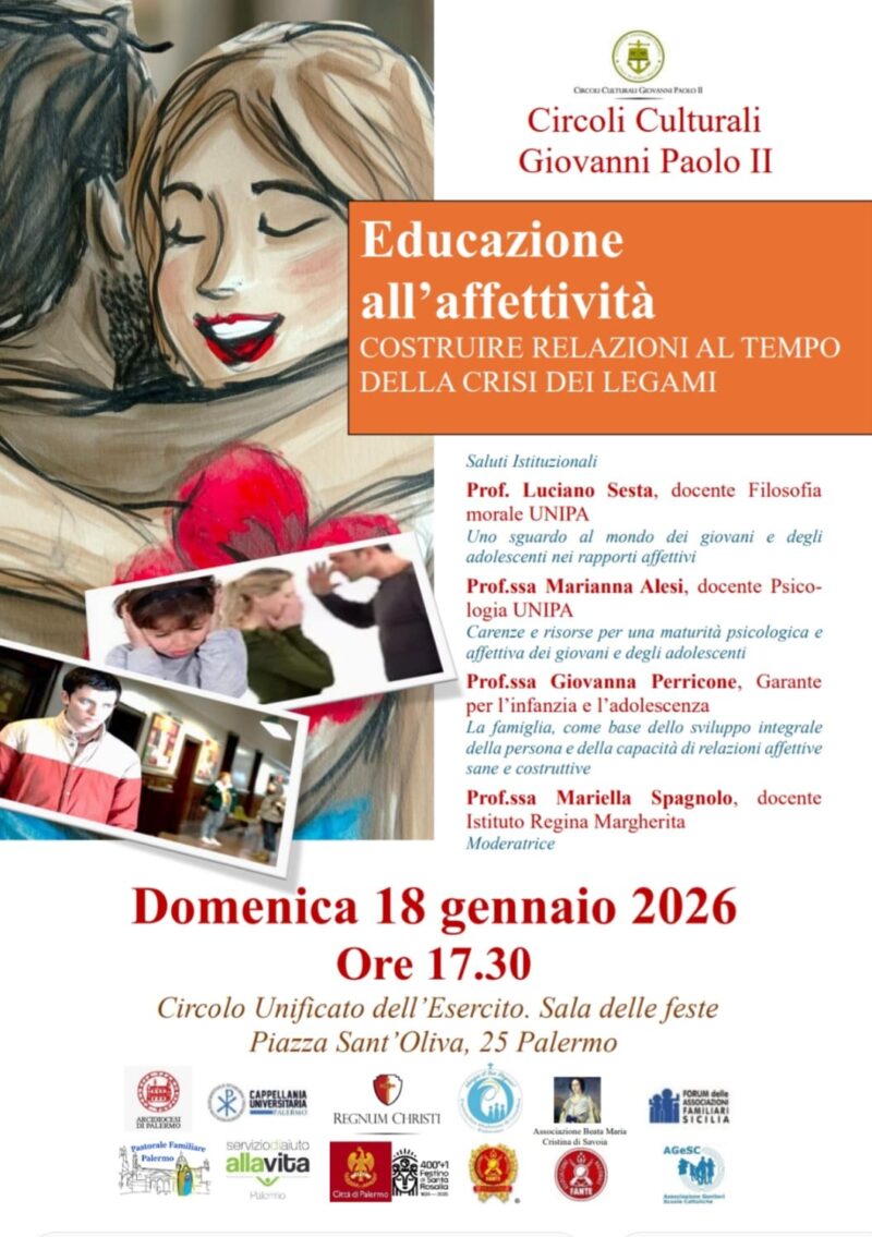 I Circoli Culturali Giovanni Paolo II di Palermo propongono un incontro su un tema di grande attualità: “Educazione all’affettività. Costruire relazioni al tempo della crisi dei legami”. Interverranno: Luciano Sesta, docente di Filosofia morale UNIPA, Marianna Alesi, docente di Psicologia UNIPA e Giovanna Perricone, Garante per l’infanzia e l’adolescenza per il Comune di Palermo.