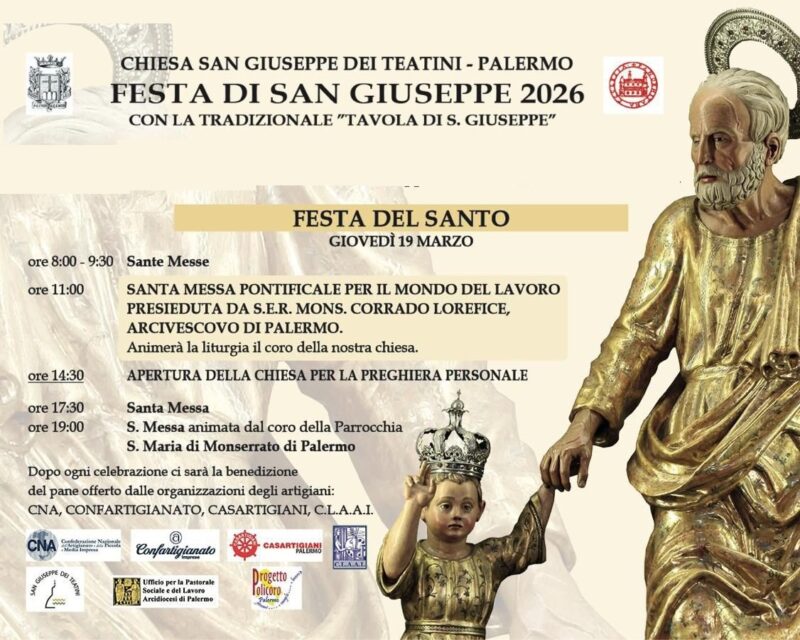 Come da tradizione, nella Chiesa di San Giuseppe dei Teatini sarà celebrata la festa di San Giuseppe: un evento preceduto da quattro giornate di preparazione e realizzato dalla Chiesa di San Giuseppe dei Teatini e dall’Ufficio diocesano per la Pastorale Sociale e del Lavoro. Coinvolte, come sempre, le organizzazioni degli artigiani CNA, Casartigiani, Confartigianato, CLAAI.