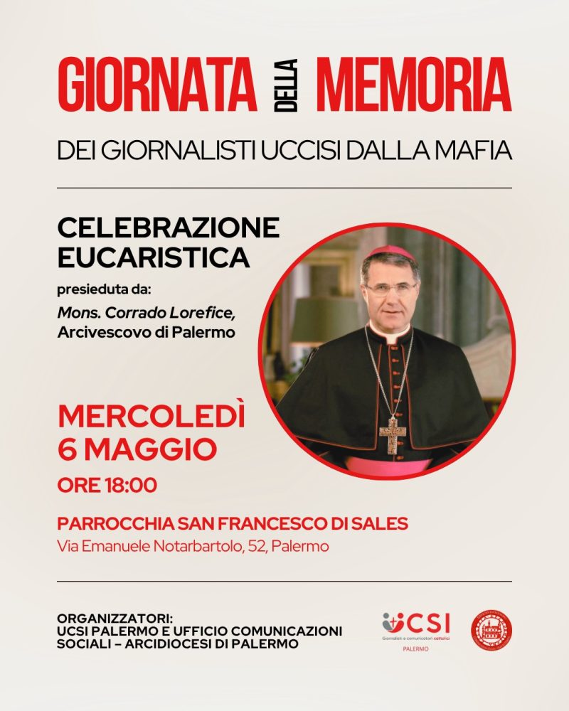 Si terrà mercoledì 6 maggio alle ore 18.00 la celebrazione Eucaristica in suffragio dei giornalisti siciliani uccisi dalla mafia in occasione della “Giornata nazionale in memoria dei giornalisti uccisi a causa della loro professione”, istituita dal Parlamento nazionale nella data del 3 maggio, in coincidenza con la “Giornata mondiale della libertà di stampa”, promossa dalle Nazioni Unite.