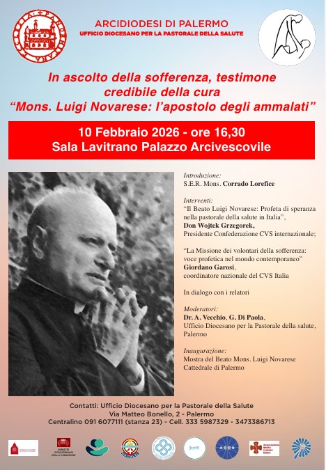 Un incontro dedicato alla figura e all’opera di Monsignor Luigi Novarese, “apostolo degli ammalati, in ascolto della sofferenza e testimone credibile della cura” è quello promosso dall’Ufficio Diocesano per la Pastorale della Salute per il prossimo 10 febbraio alle ore 16.30 presso il Salone Lavitrano del Palazzo Arcivescovile di Palermo (via Vittorio Emanuele 461).
