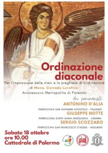 Sono tre gli alunni del Seminario Arcivescovile “San Mamiliano” chiamati all’Ordinazione Diaconale per l’imposizione delle mani e la preghiera dell’Arcivescovo di Palermo Mons. Corrado Lorefice.