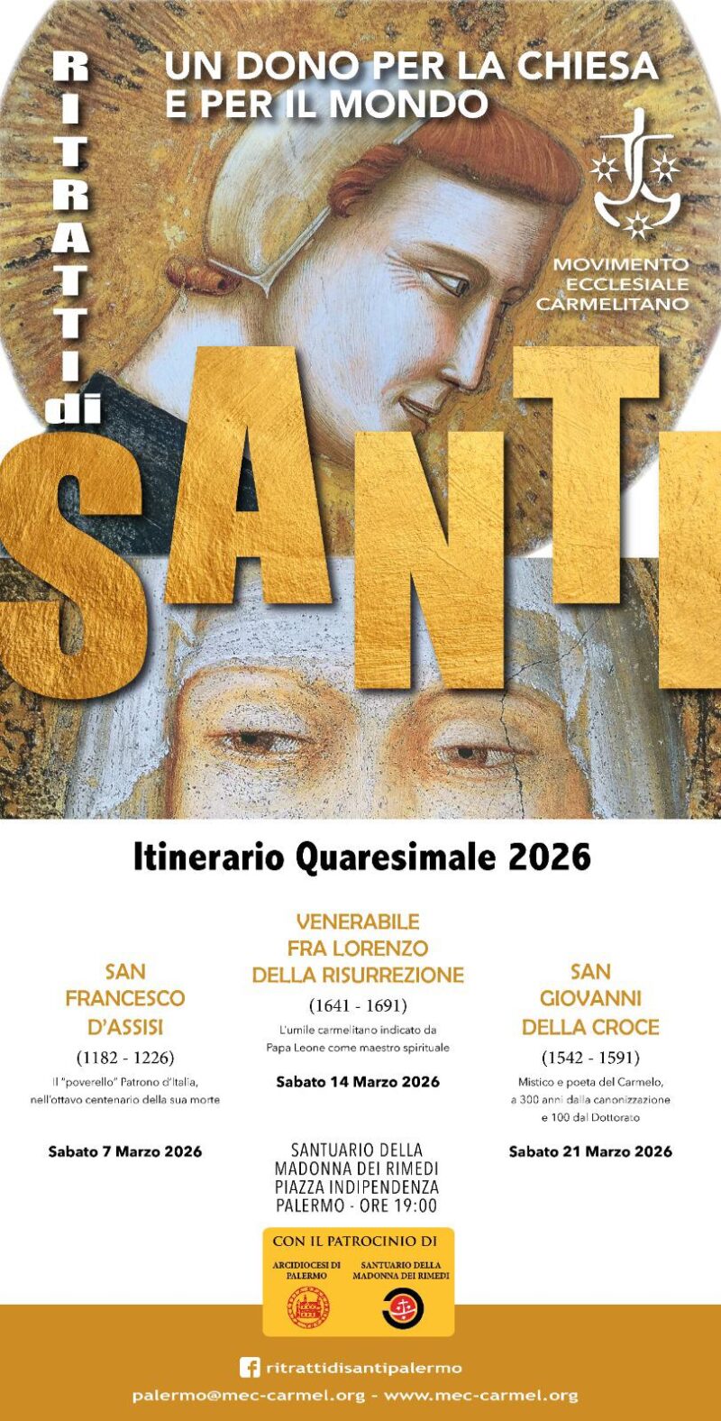 Il MEC, Movimento Ecclesiale Carmelitano, propone un itinerario quaresimale attraverso tre figure di santi “dono per la Chiesa e per il mondo”. Gli incontri, con il patrocinio dell’Arcidiocesi di Palermo e del Santuario della Madonna dei Rimedi, avranno luogo presso il Santuario di piazza Indipendenza a Palermo alle ore 19.00: