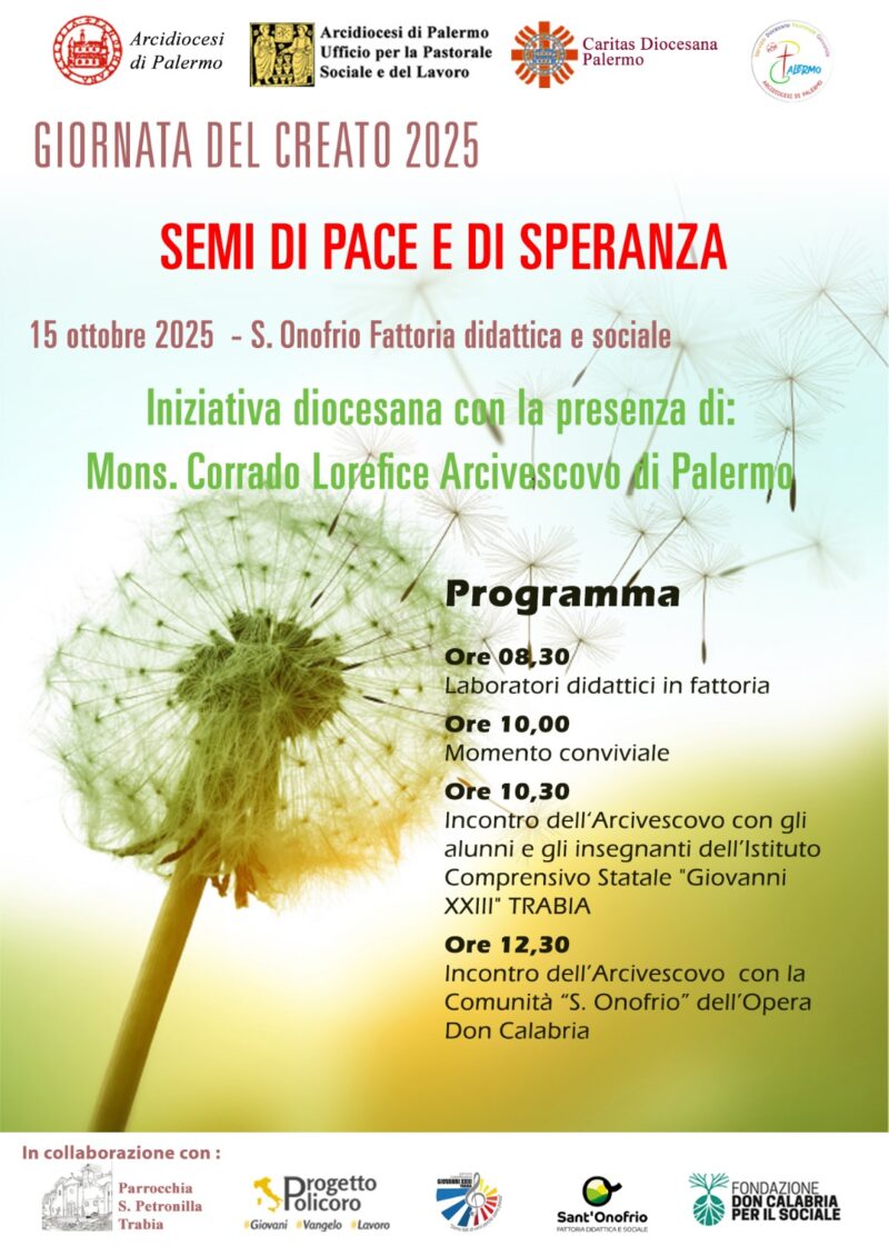 Il prossimo 15 ottobre si celebra la Giornata diocesana del Creato che avrà come tema “Semi di pace e di speranza”: sarà il momento di sintesi del lungo cammino del Tempo del Creato 2025, un itinerario promosso dall’Ufficio diocesano per la Pastorale Sociale e del Lavoro, dalla Caritas Diocesana e dal Servizio diocesano per la Pastorale Giovanile in collaborazione con la Parrocchia S. Petronilla di Trabia, con il Progetto Policoro, con la Fattoria didattica e sociale Sant’Onofrio, con la Fondazione Don Calabria e con l’Istituto Comprensivo Giovanni XXIII di Trabia.