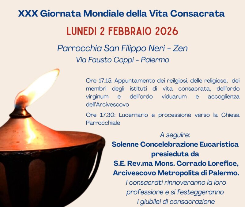 Sarà la Parrocchia San Filippo Neri a ospitare, lunedì 2 febbraio 2026, la XXX Giornata Mondiale della Vita Consacrata promossa dal Vicariato per la Vita Consacrata dell’Arcidiocesi di Palermo con il coinvolgimento di CISM, USMI, CIIS, OV, OVID. Ore 17.15, appuntamento dei religiosi, delle religiose, dei membri degli istituti di vita consacrata, dell’Ordo Virginum e dell’Ordo Viduarum. Accoglienza dell’Arcivescovo. Ore 17.30, Lucernario e processione verso … Continua a leggere Verso la XXX Giornata Mondiale della Vita Consacrata