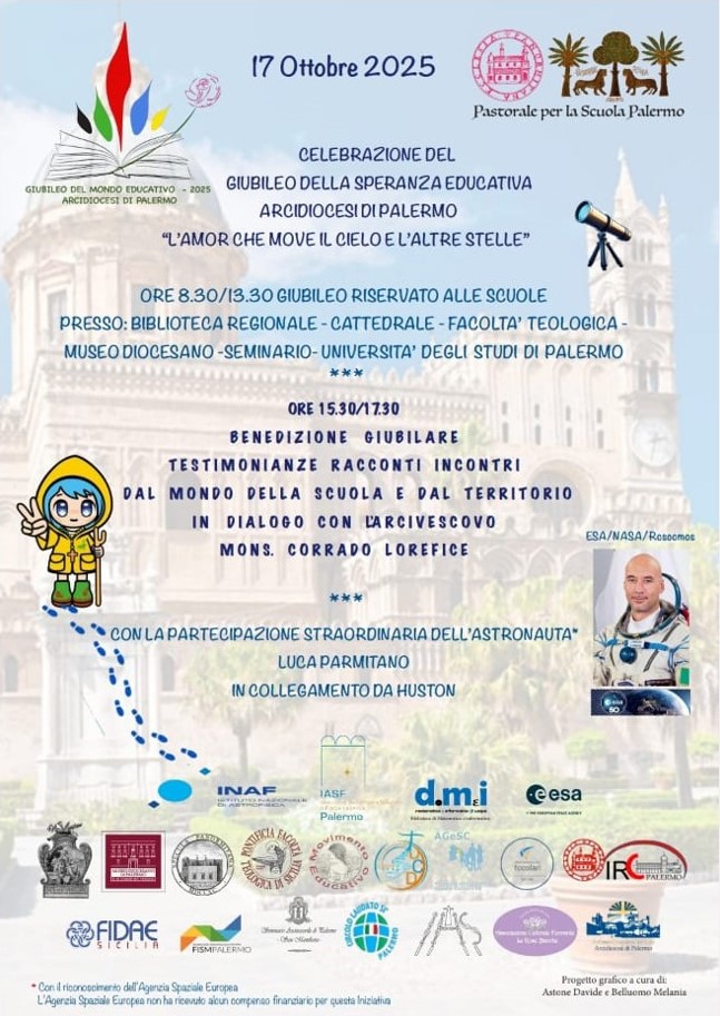 GIUBILEO DELLA SPERANZA EDUCATIVA – ARCIDIOCESI DI PALERMO In occasione del Giubileo del Mondo Educativo, Grande Evento previsto per l’Anno Giubilare in corso, l’Arcidiocesi di Palermo desidera dare eco locale al tema della “Speranza educativa” coinvolgendo le scuole e il mondo dell’educazione, secondo un programma esperienziale che ha lo scopo di far vivere il tema giubilare attraverso uno sguardo di meraviglia verso l’ordine armonico dell’universo … Continua a leggere “L’amor che move il cielo e l’altre stelle”: 17 ottobre 2025, si celebra il Giubileo della Speranza Educativa