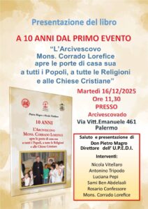 “Questa è la vostra casa, siete i benvenuti”: così l’Arcivescovo di Palermo, in questi dieci anni, ha accolto i rappresentanti di tutte le fedi presenti a Palermo nei giorni dedicati a Santa Rosalia. Adesso quelle esperienze diventano un libro scritto da Don Pietro Magro (Direttore dell’Ufficio Diocesano per l’Ecumenismo e il dialogo) e Nicola Vitellaro dal titolo “10 anni – l’Arcivescovo Mons. Corrado Lorefice apre le porte di casa sua a tutti i Popoli, a tutte le Religioni e alla Chiese Cristiane”.