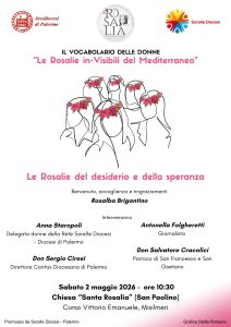 Ancora un appuntamento con “Il vocabolario delle donne: le Rosalie in-Visibili del Mediterraneo”: sarà la chiesa di Santa Rosalia (San Paolino) di Misilmeri (corso Vittorio Emanuele) a ospitare, sabato 2 maggio 2026 alle ore 10.30, “Le Rosalie del desiderio e della speranza”.